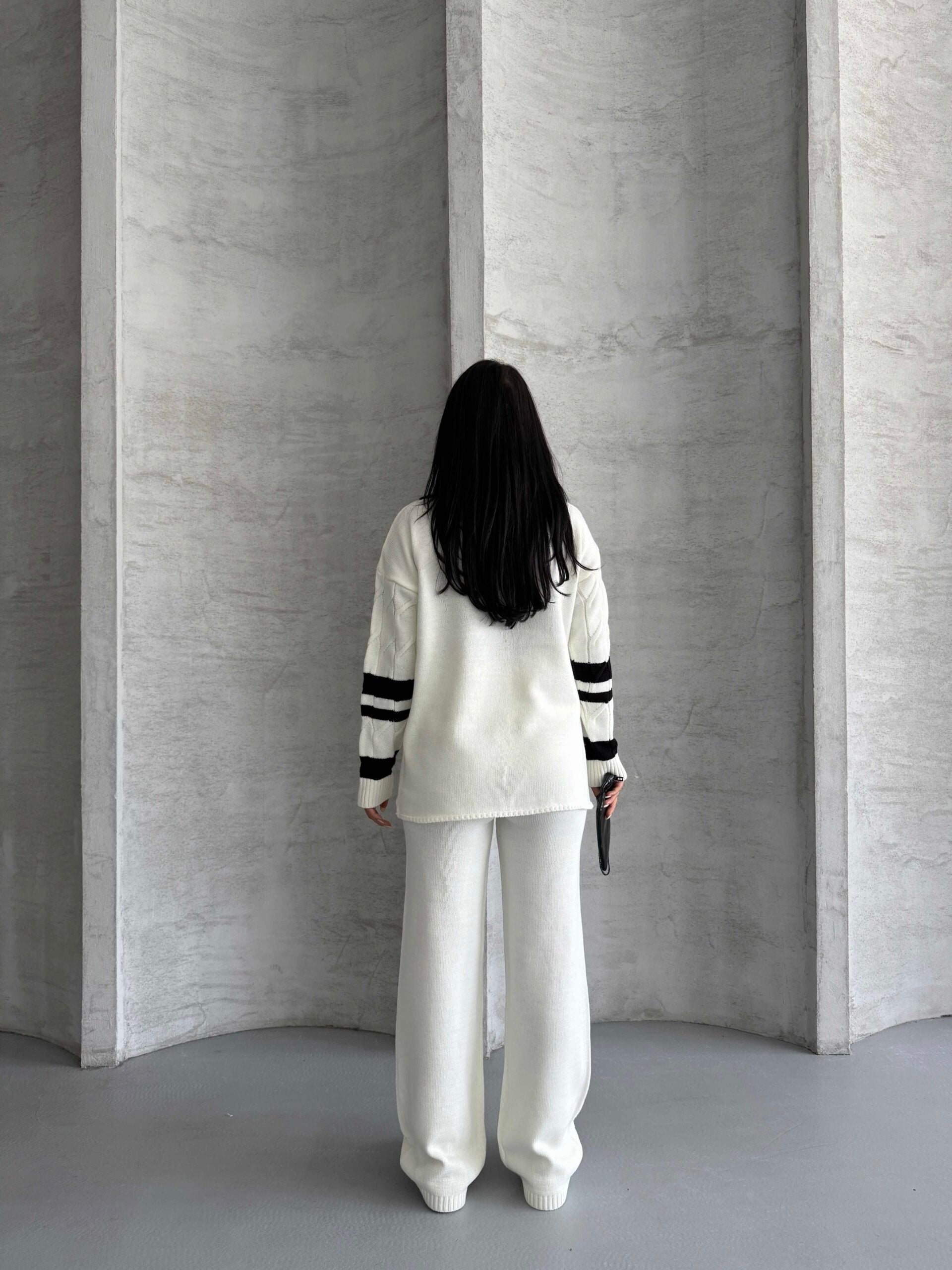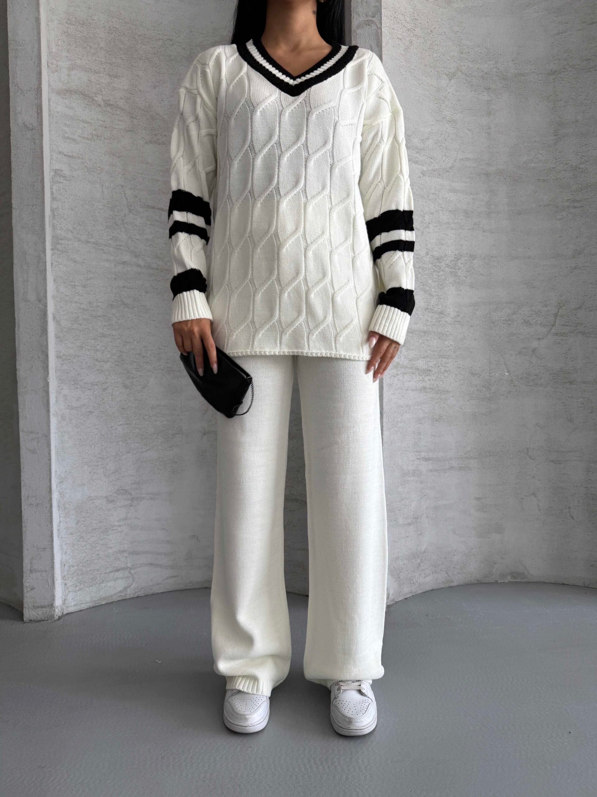 Ürün İçeriği: %30 Yün %70 Akrilik Model Bedeni: (S/M Beden) Eu:36-38 Us:4-6 Ürün Ölçüleri Üst Kazak: Boy: 72 cm - En: 50 cm - Omuz: 52 cm - Kol Boyu: 52 cm Alt Pantolon: Bel: 32 cm - Basen: 45 cm - Boy: 115 cmSeçenekleri belirleyin