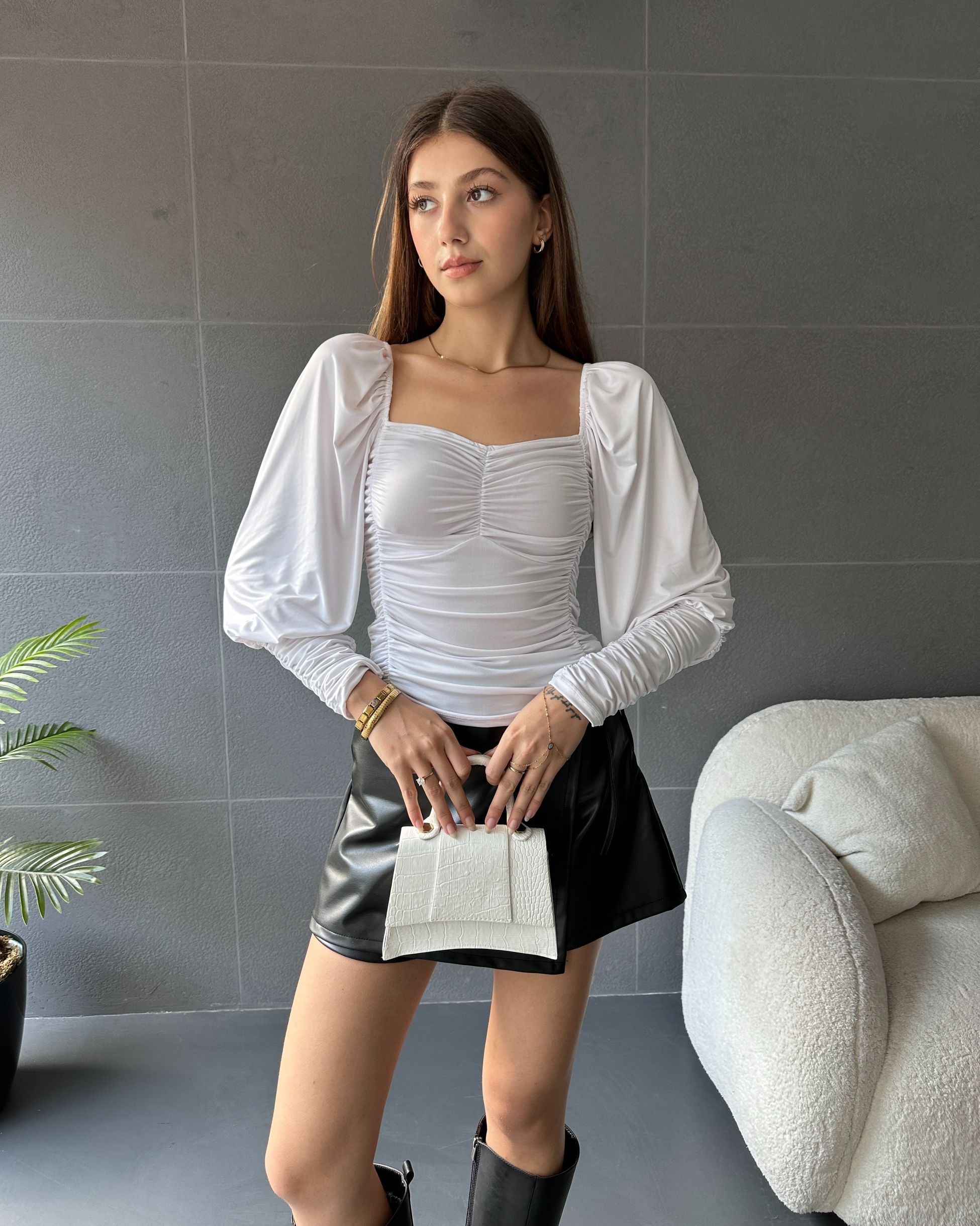 Ürün Adı :Kalp Yaka Önü Ve Manşeti Drapeli Bluz