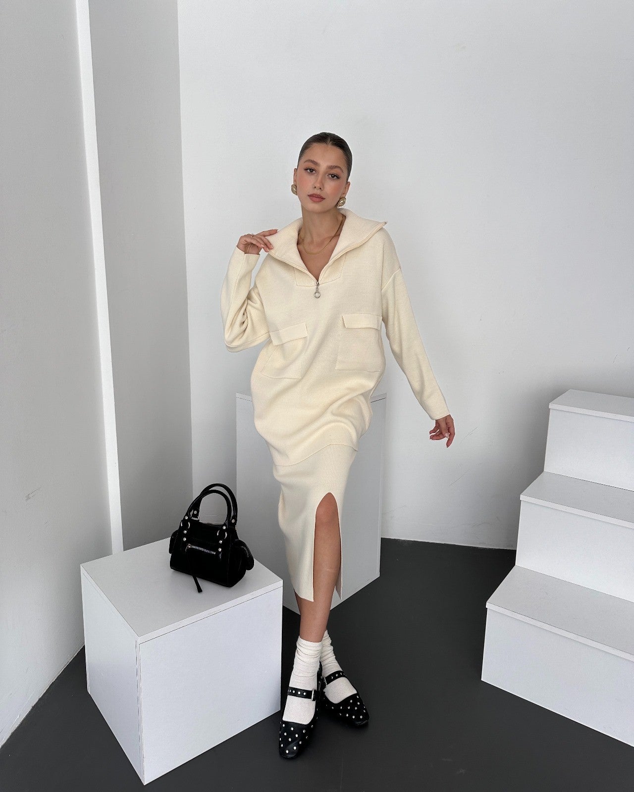 Ürün Adı :Fermuarlı Kazak Ve Yırtmaç Detaylı Etek Alt Üst Triko Takım