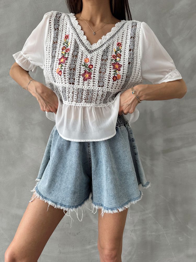 Topshow Krem Gri Nakışlı Toptan Bluz