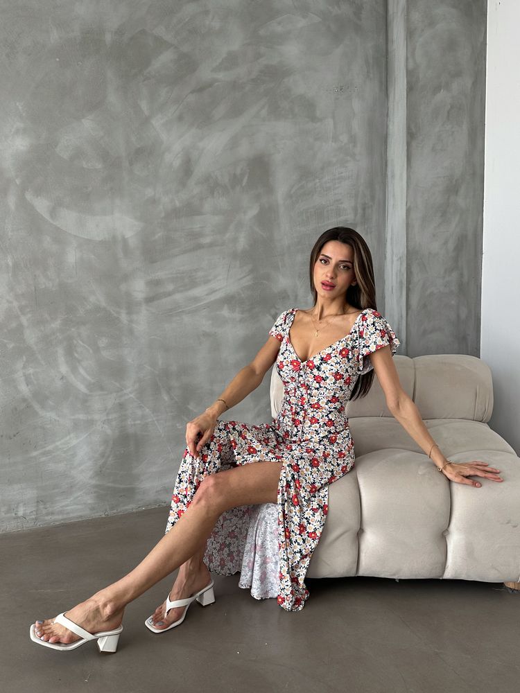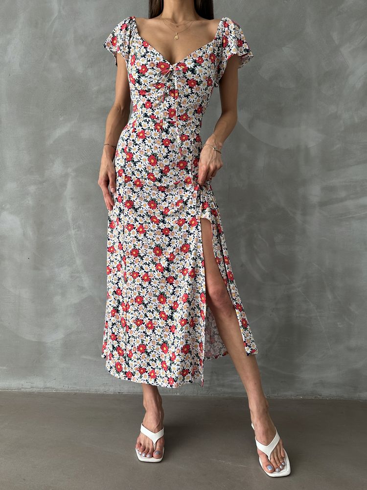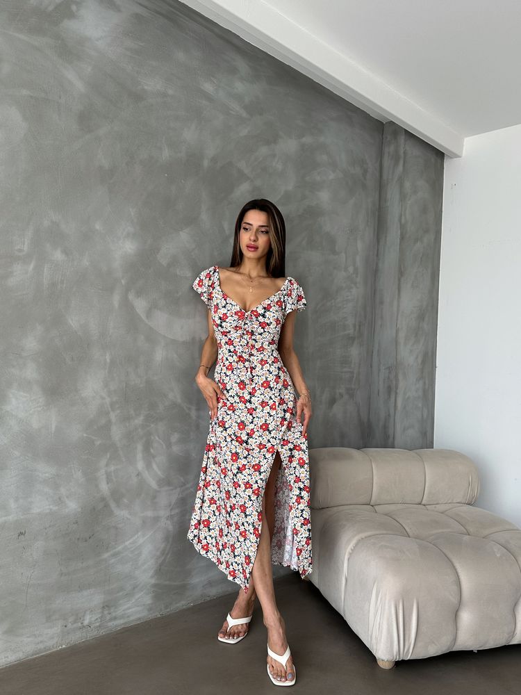 Topshow Kırmızı Çiçek Baskılı Toptan Elbise