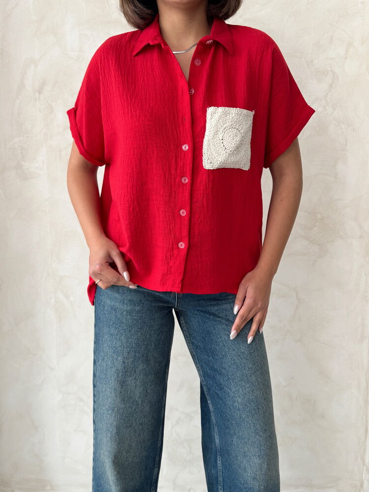 Topshow Kırmızı Keten Ham Cep Aplik Cepli Keten Toptan Gömlek