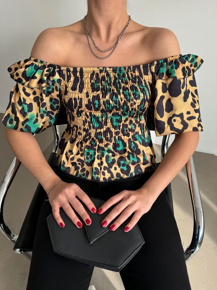 Topshow Leopar Zümrüt Gibeli Kayık Yaka Toptan Bluz