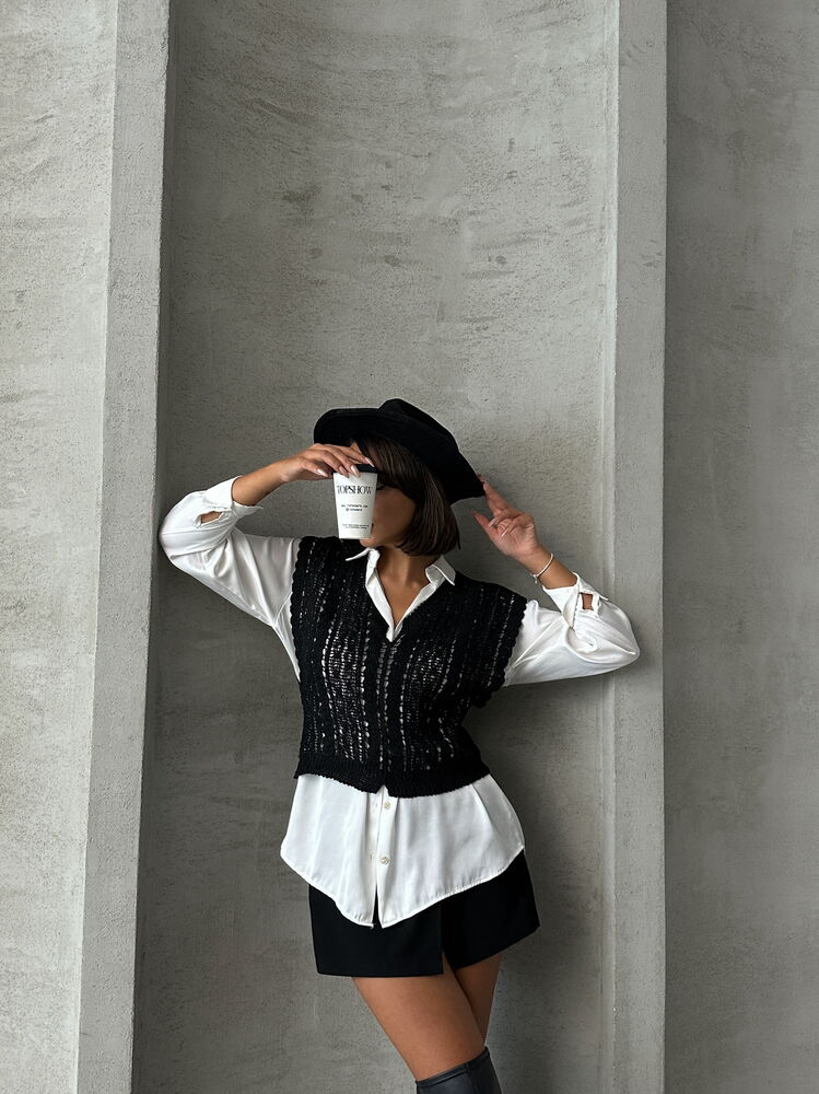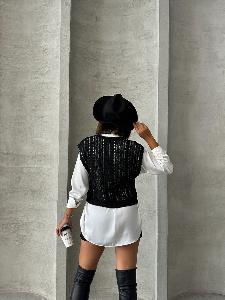 Topshow Siyah Saç Örgülü V Yaka Toptan Bluz