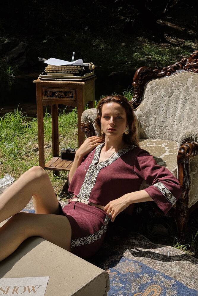Topshow Toptan Etnik Desenli V Yaka Bordo Gömlek – Şık ve Modern Tarz