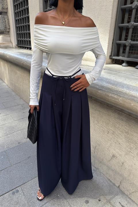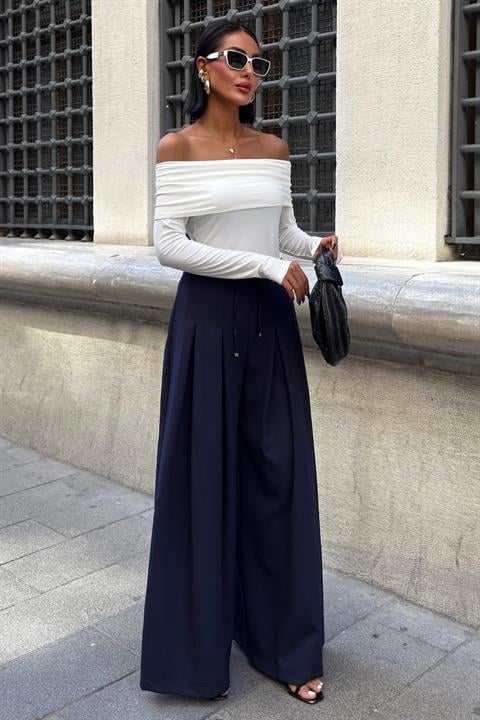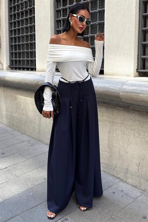 Bel Bağlama Detaylı Pileli Salaş Pantolon 0084