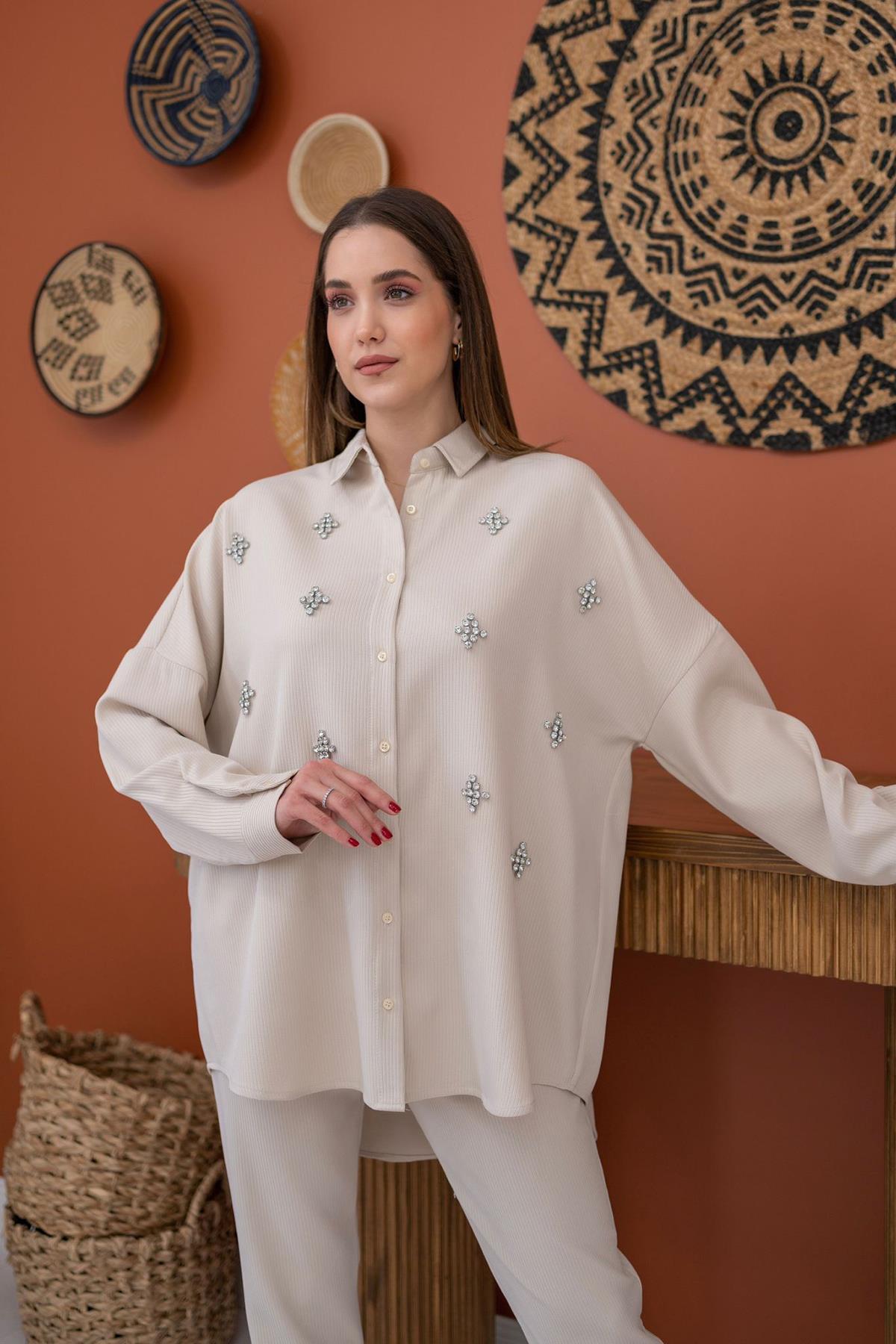 Toptan Bej Gömleği Taşlı Fitilli Takım