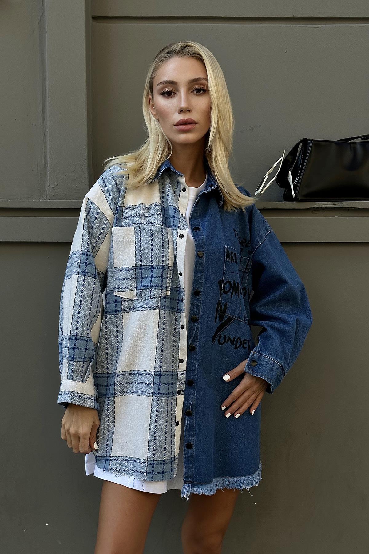 Toptan Mavi Kot Garni Parçalı Gömlek