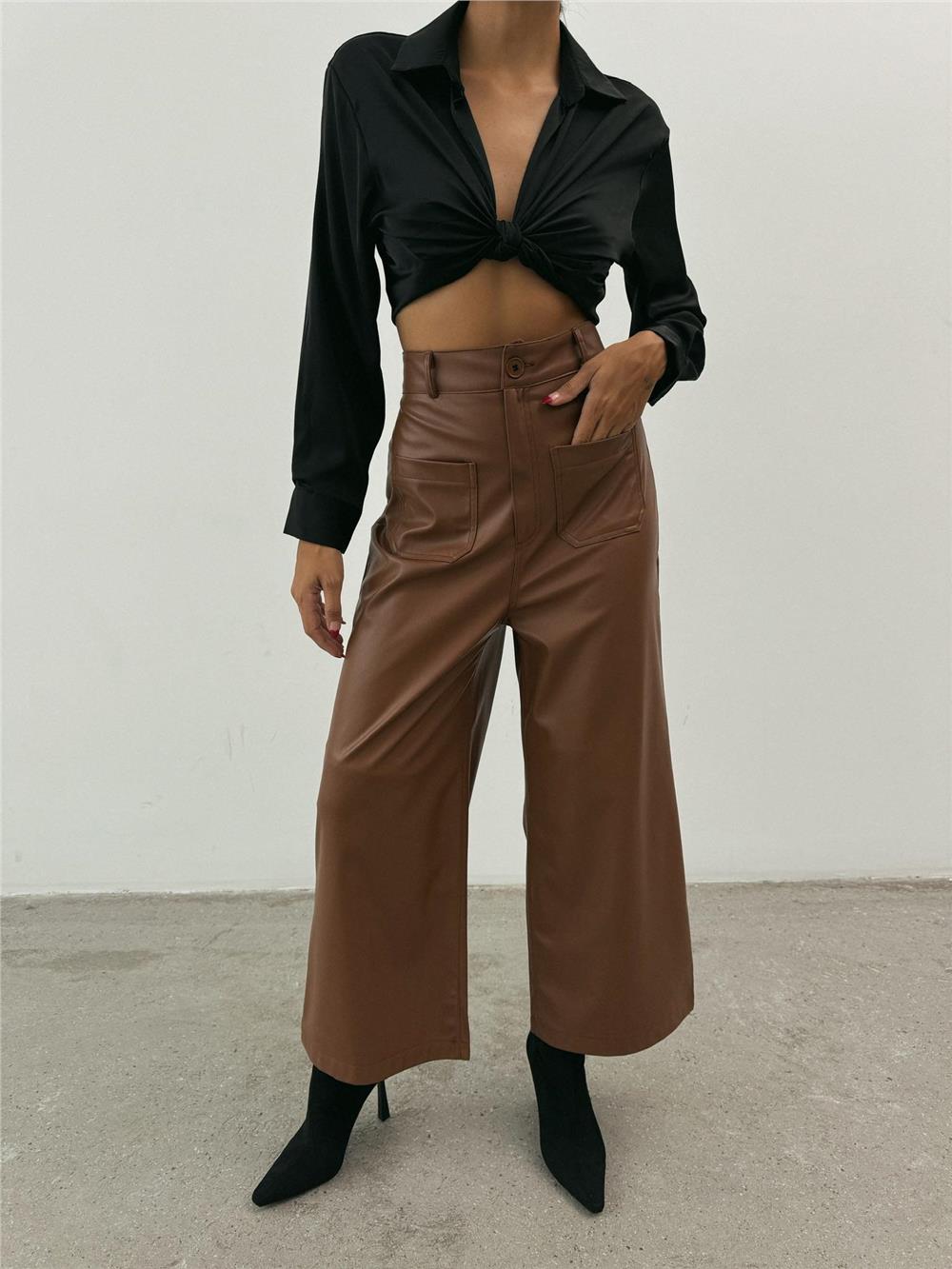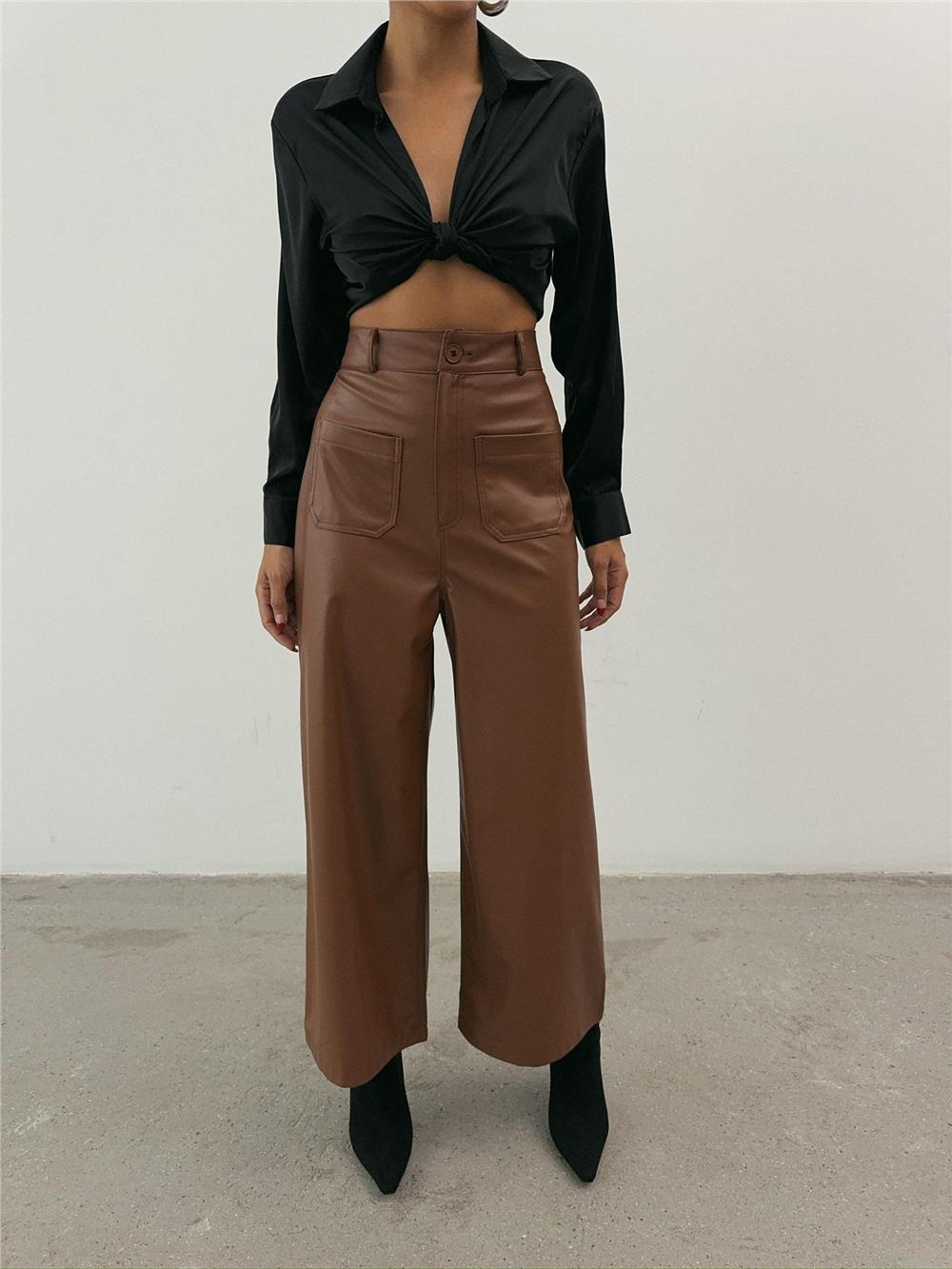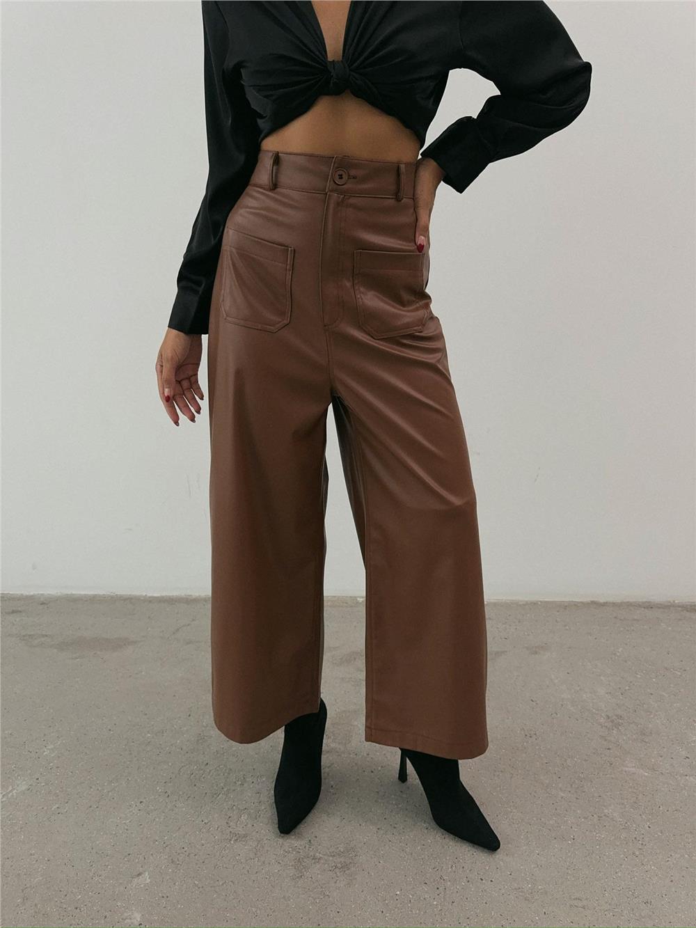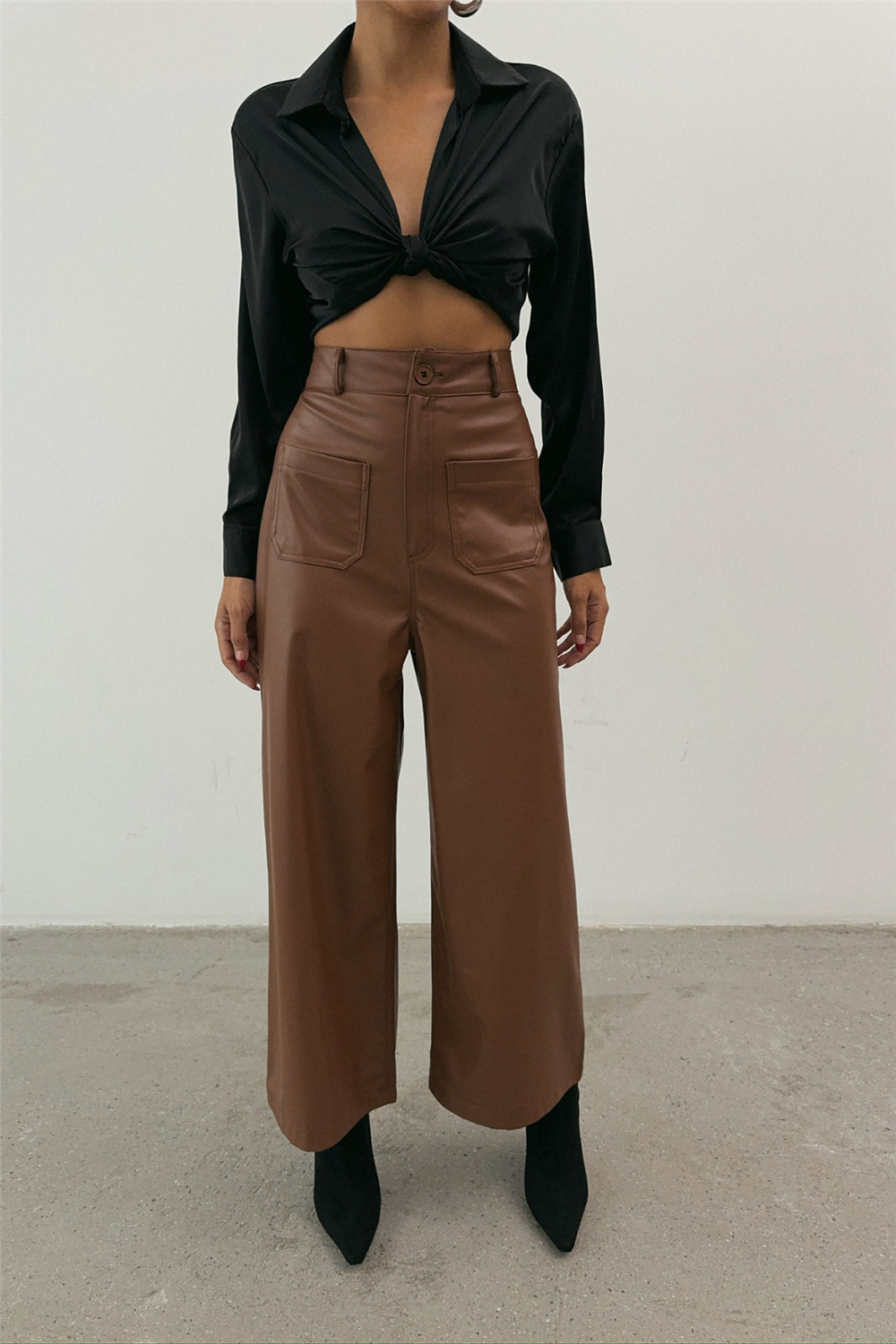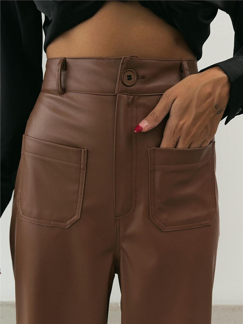 ÖN CEP DETAYLI DERİ PANTOLON - Taba