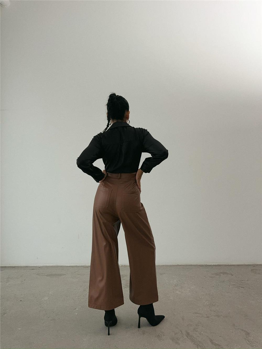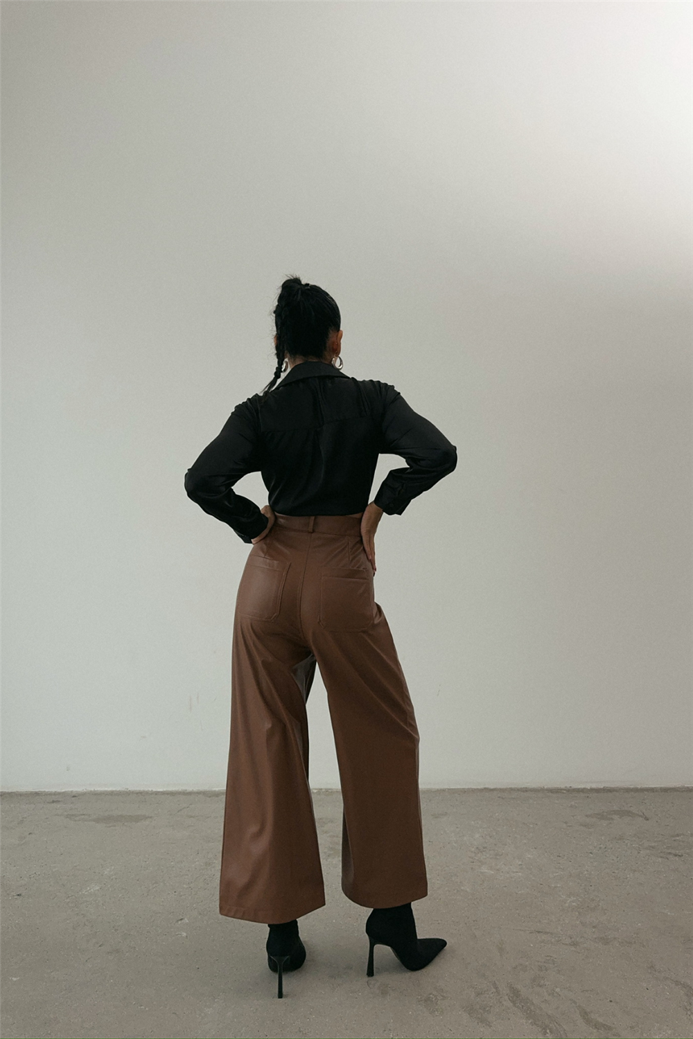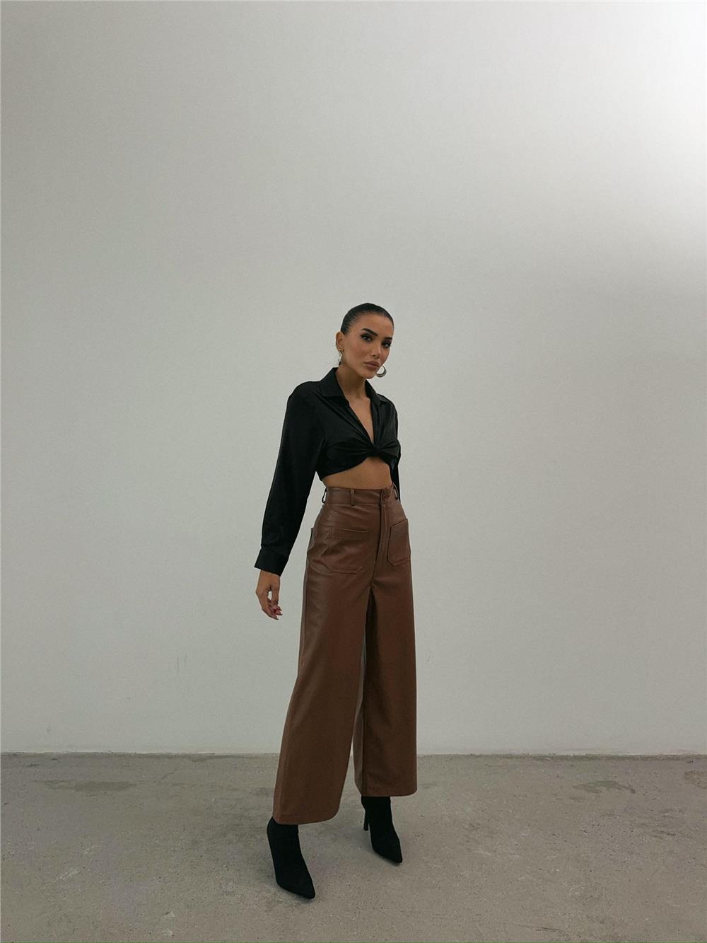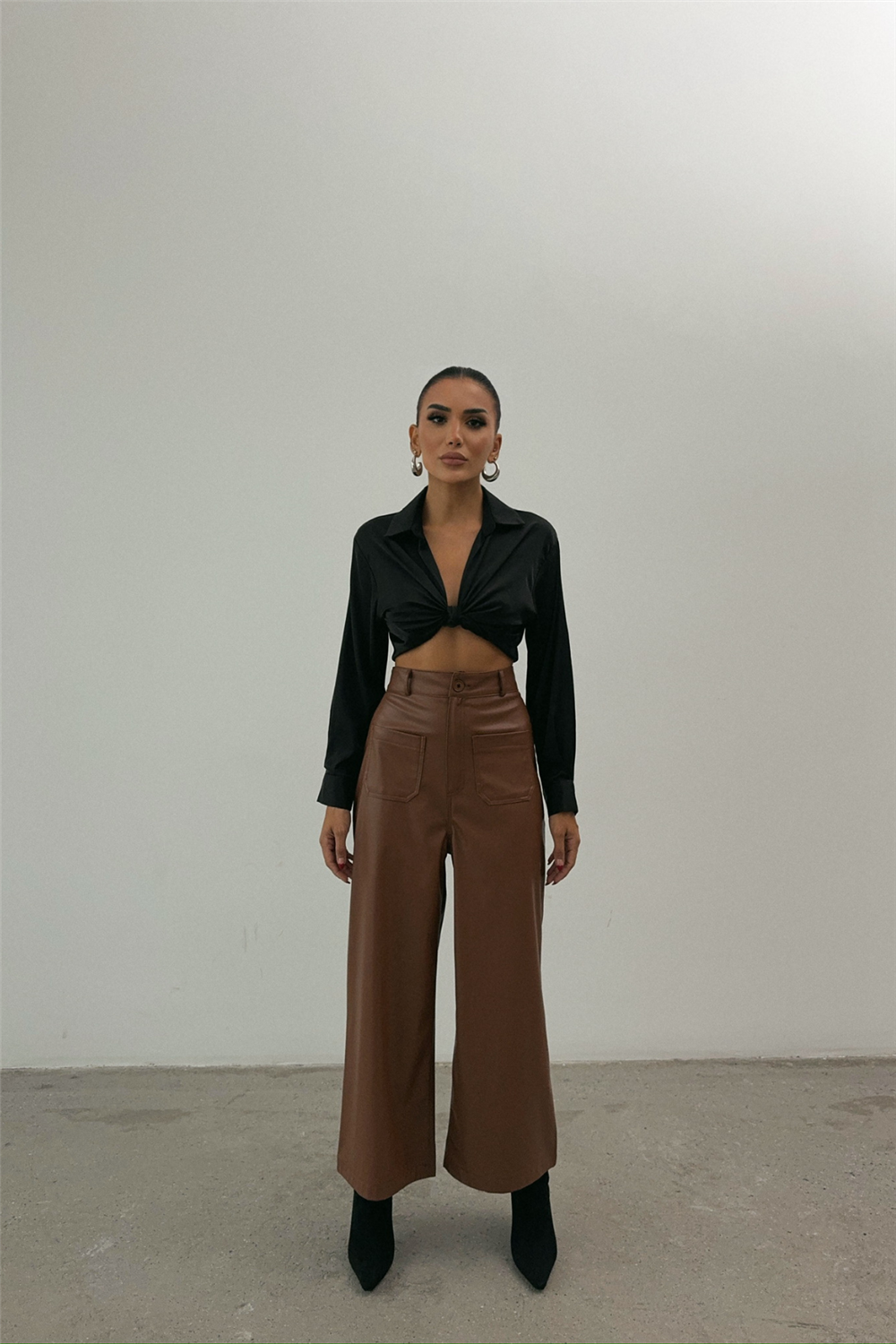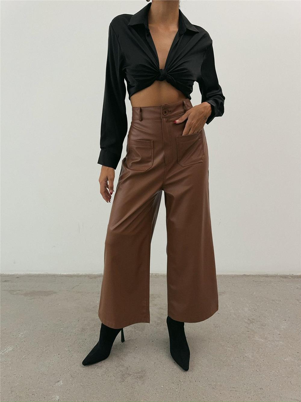 ÖN CEP DETAYLI DERİ PANTOLON - Taba