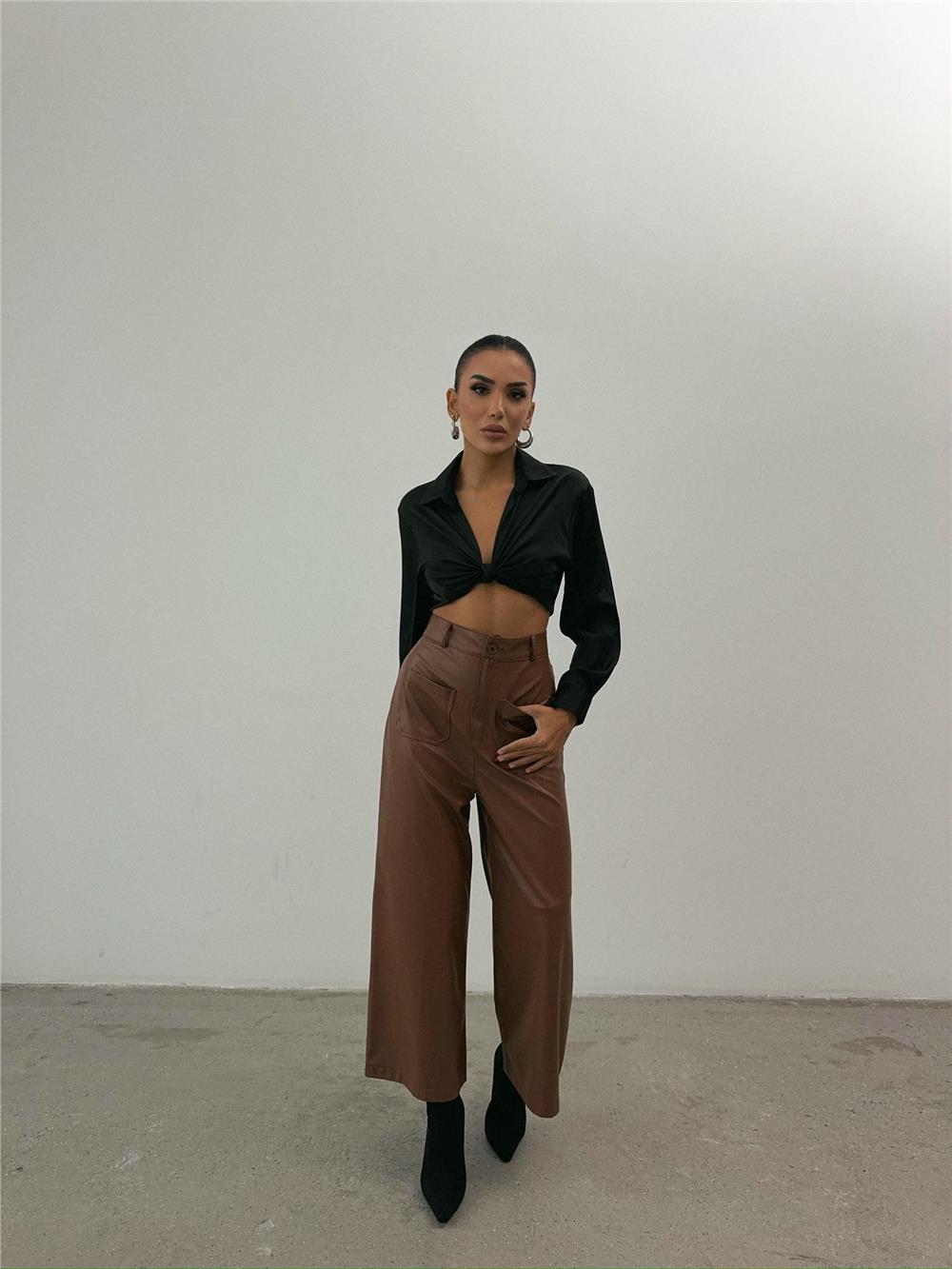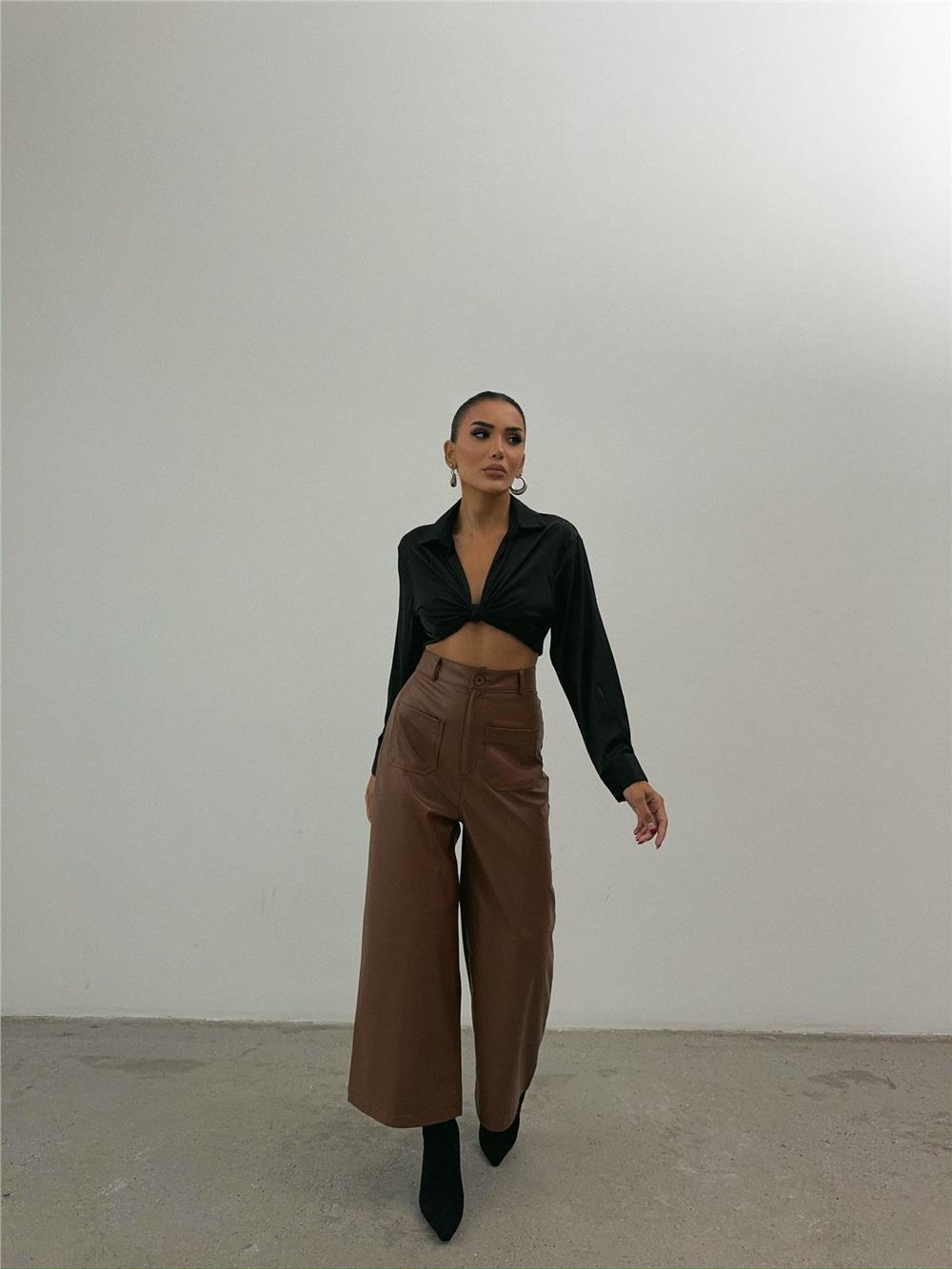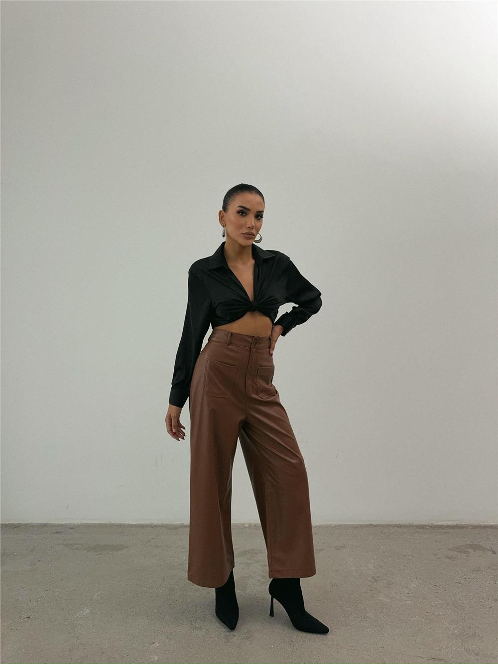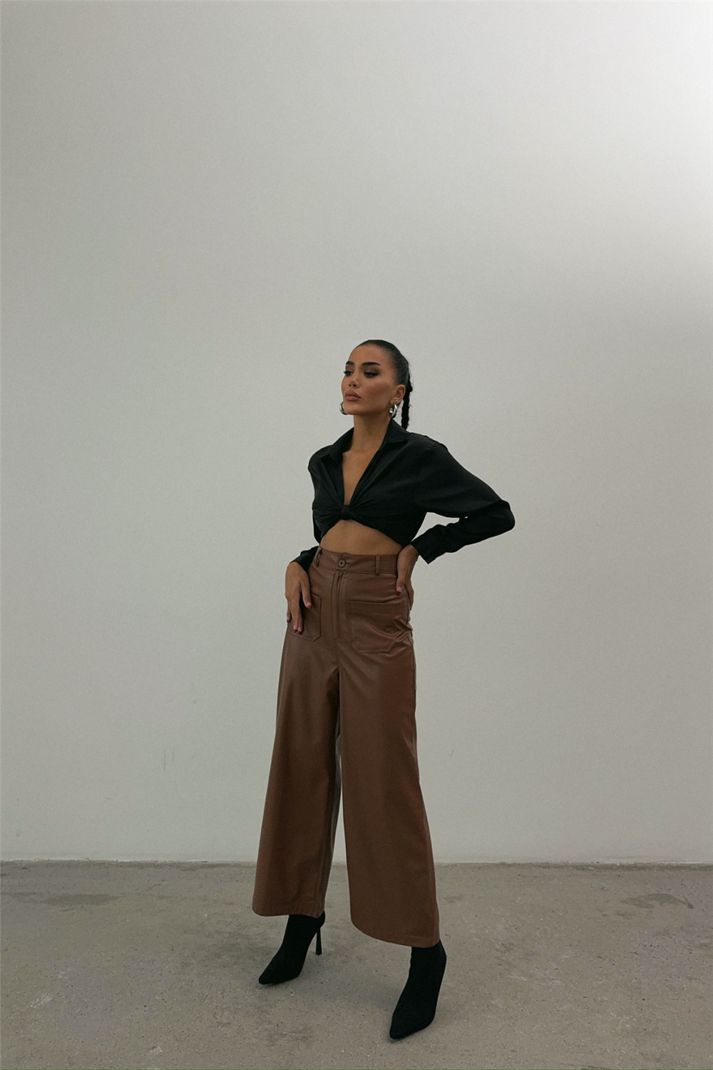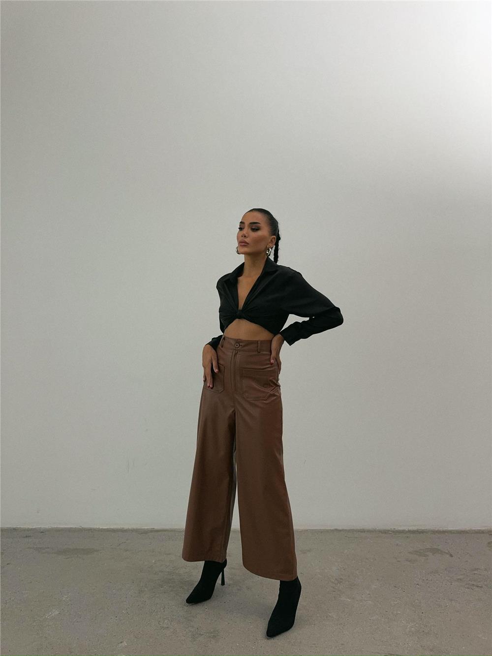 ÖN CEP DETAYLI DERİ PANTOLON - Taba