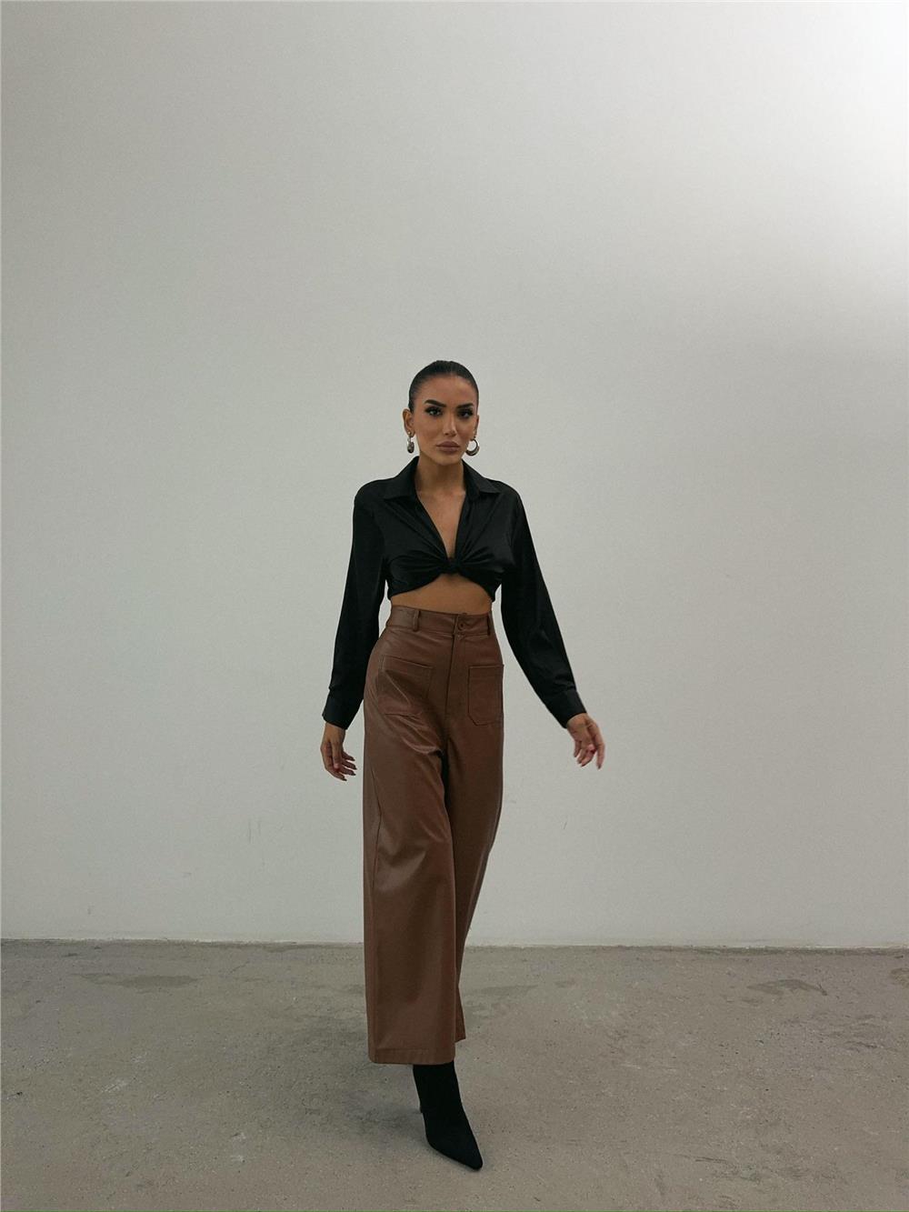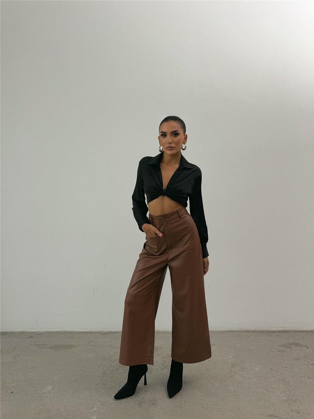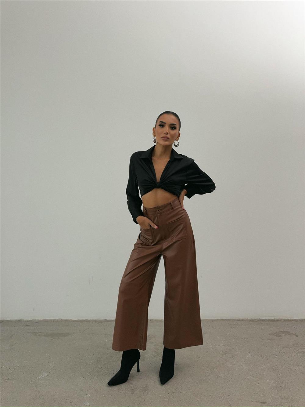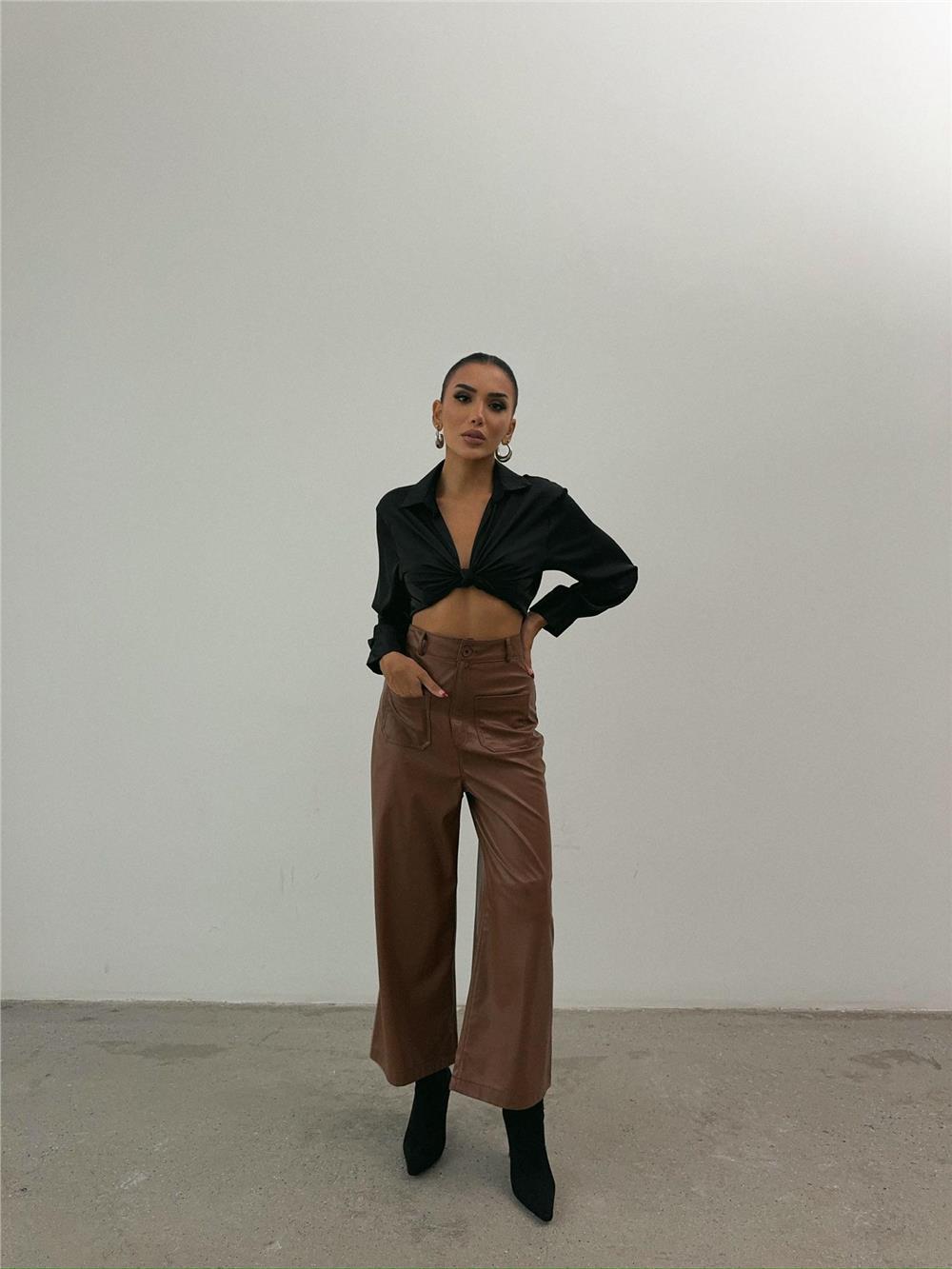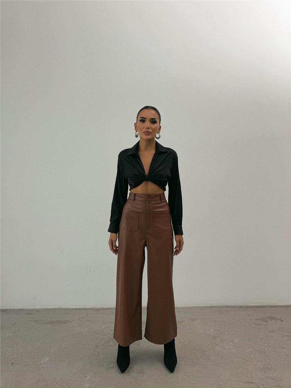 ÖN CEP DETAYLI DERİ PANTOLON - Taba