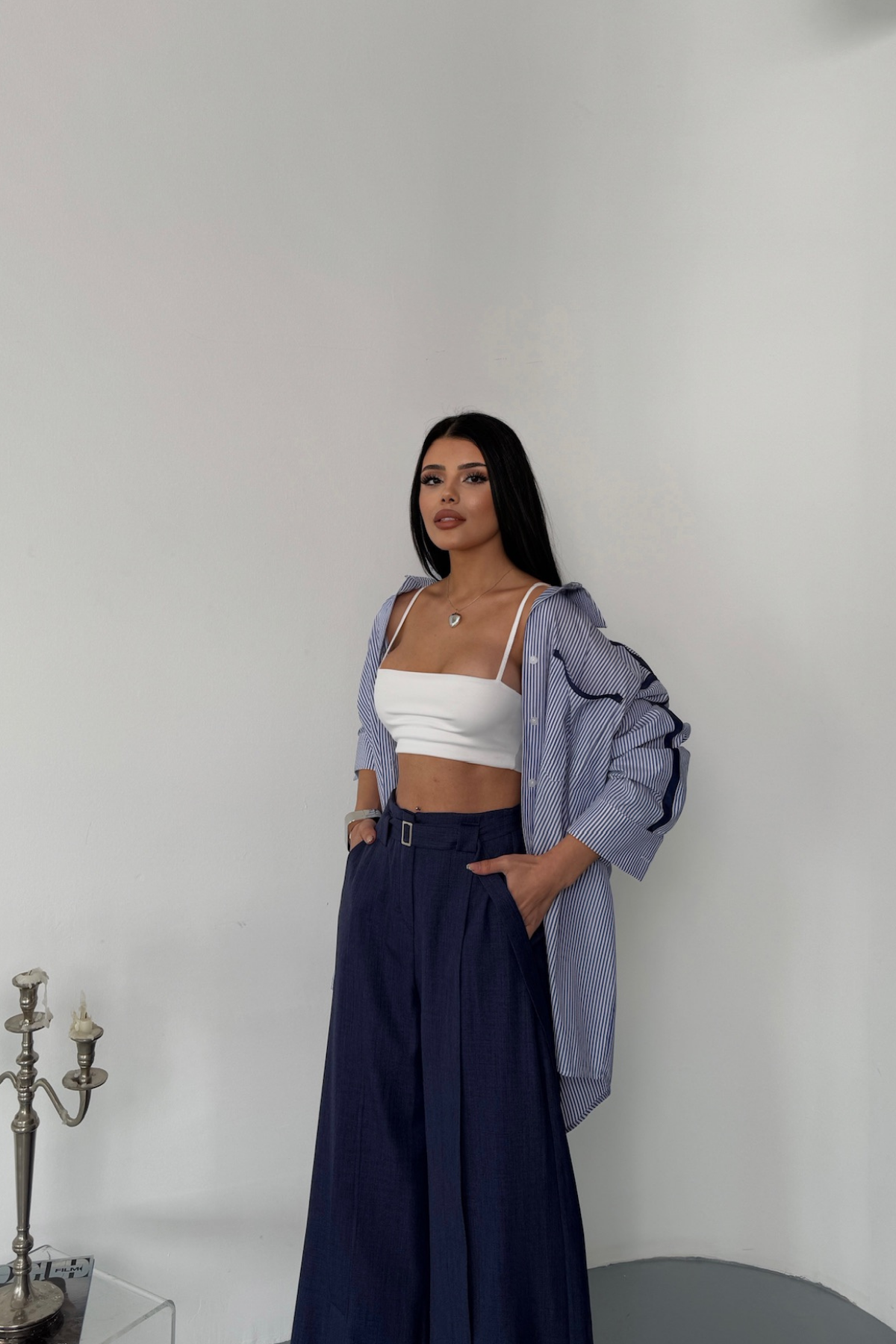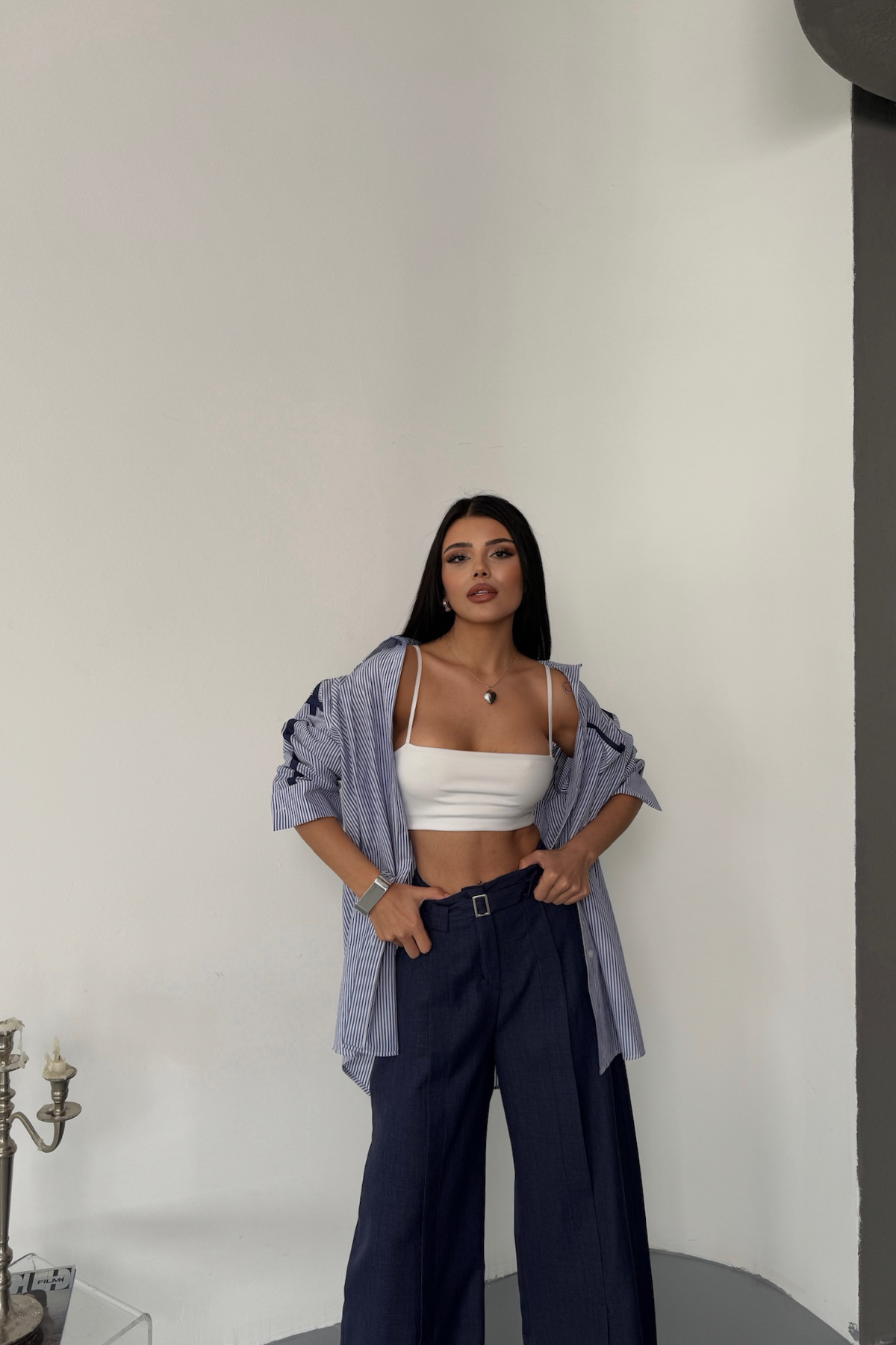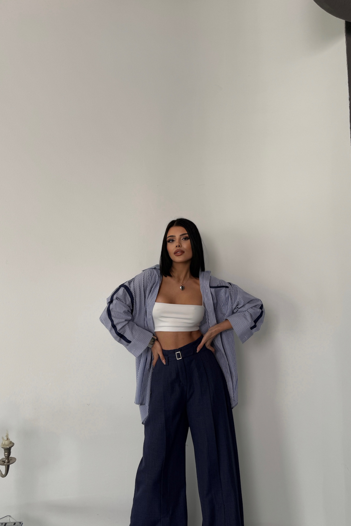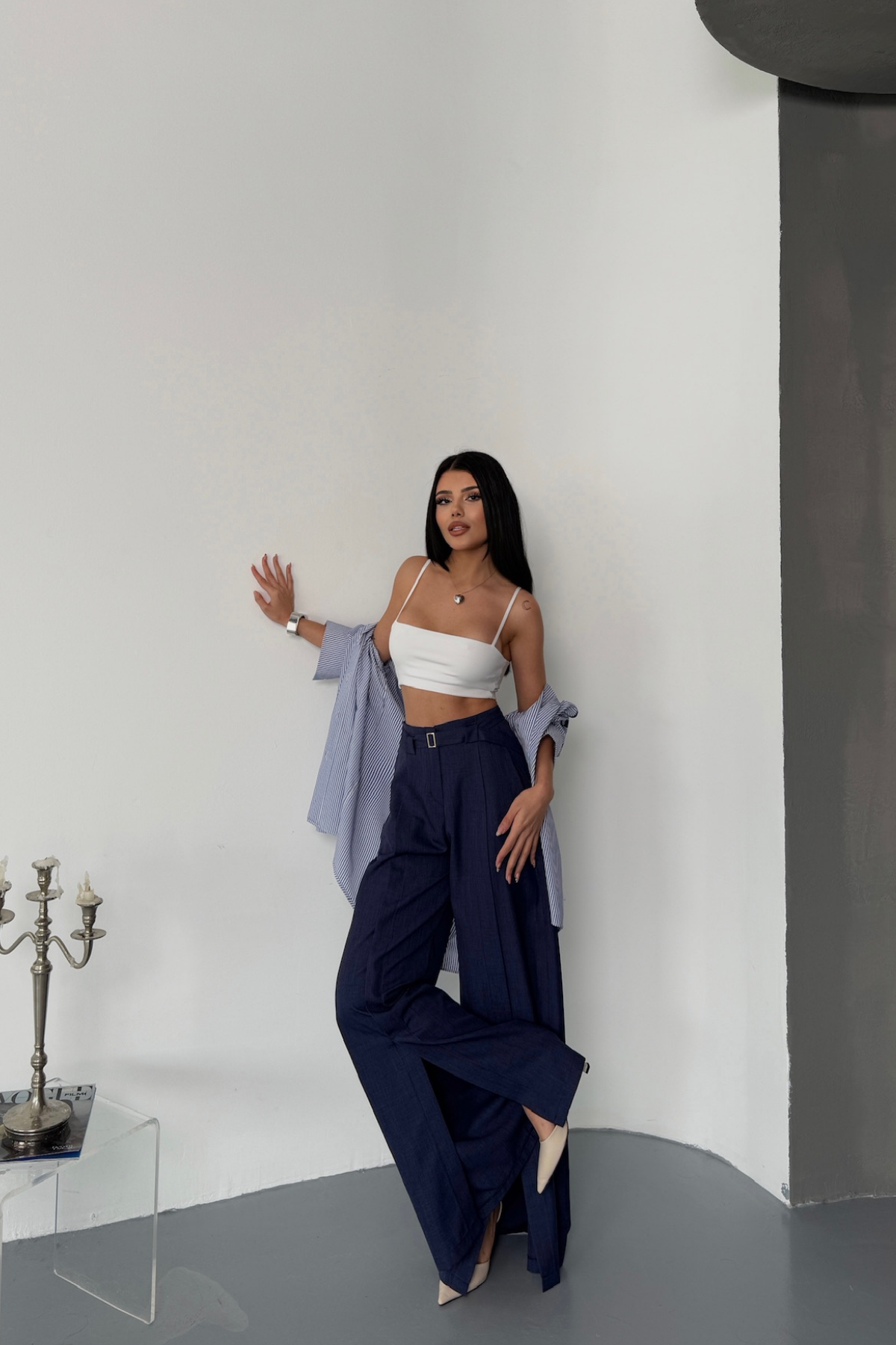 SALAŞ ÖNDEN YIRTMAÇ DETAYLI BEL KEMERLİ PANTOLON - Lacivert