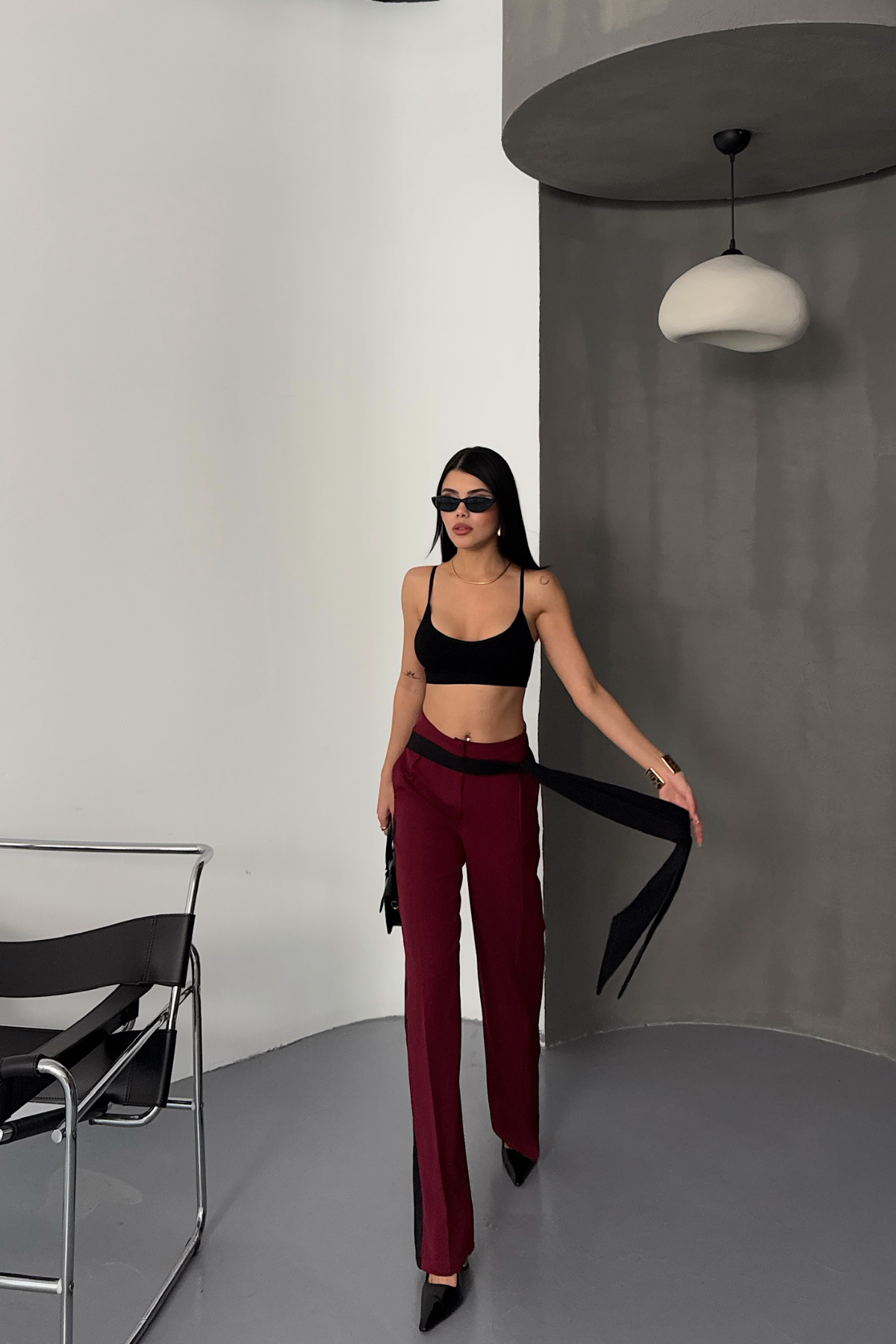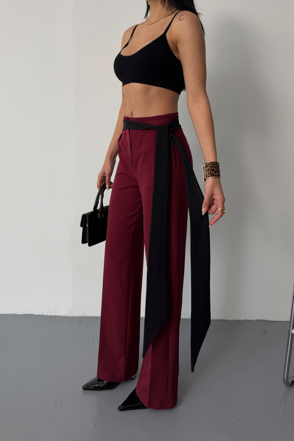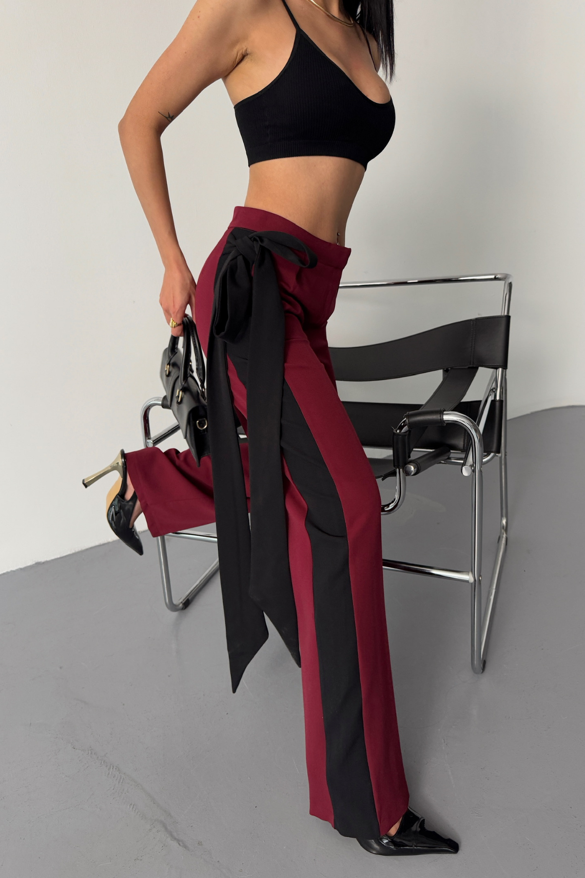 YAN ŞERİT VE KUŞAK DETAYLI TASARIM PANTOLON - Bordo