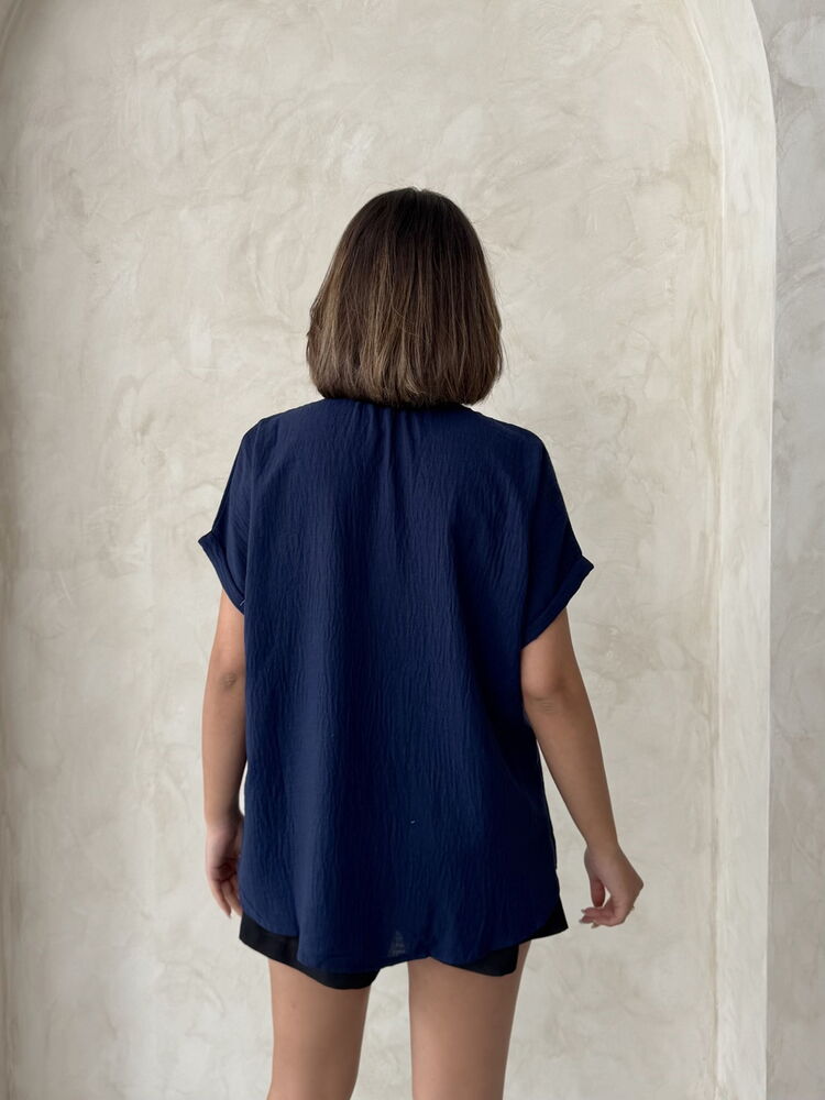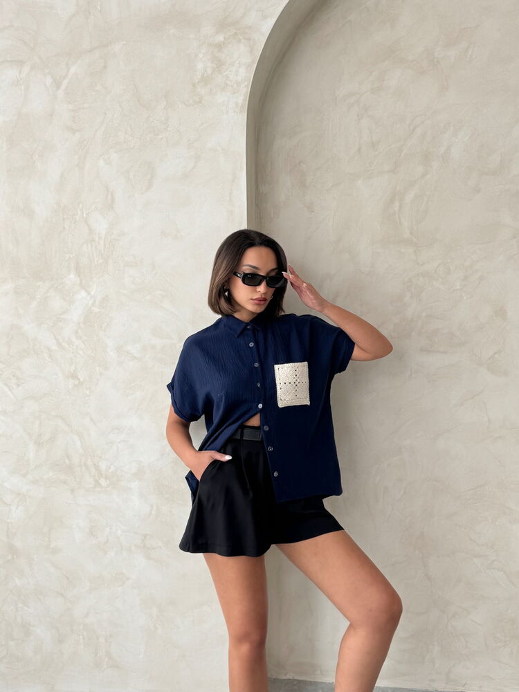 Topshow Lacivert Keten Ham Cep Aplik Cepli Keten Toptan Gömlek