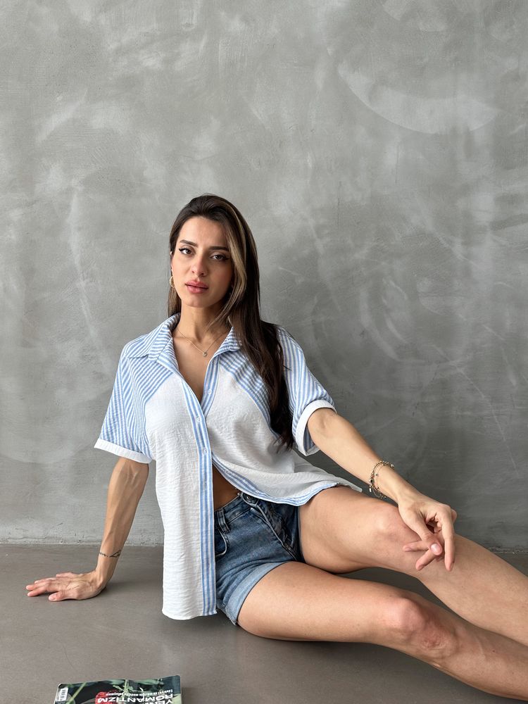 Topshow Mavi Çizgi Detaylı Düşük Kol Toptan Gömlek