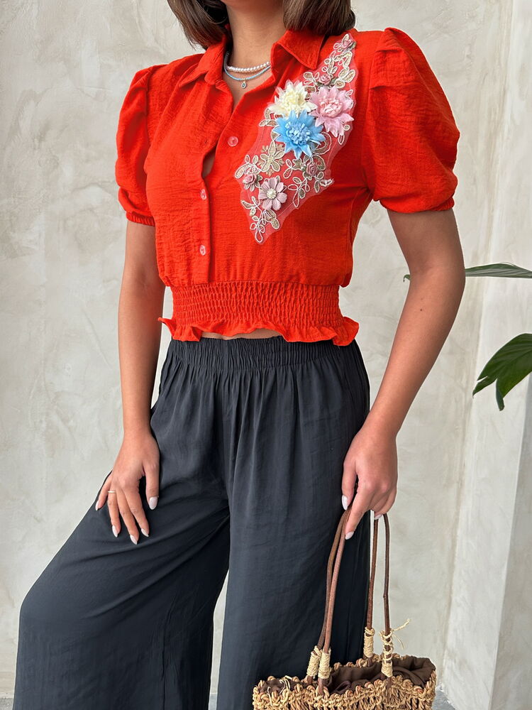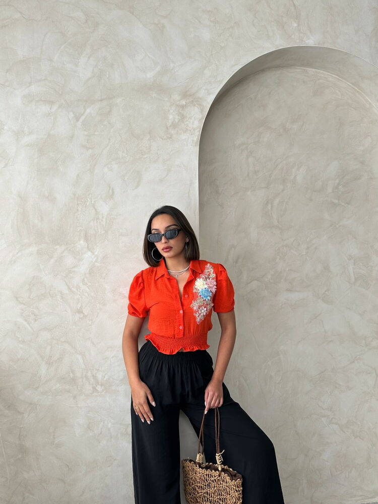 Topshow Oranj Göğsü Çiçekli Keten Toptan Gömlek